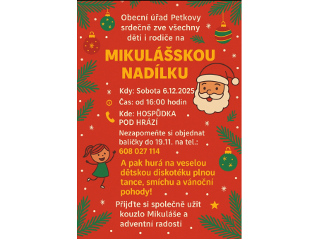 Obecní úřad Petkovy zve na Mikulášskou nadílku v sobotu 6. 12. 2025 od 16 hodin na sál do Hospůdky.